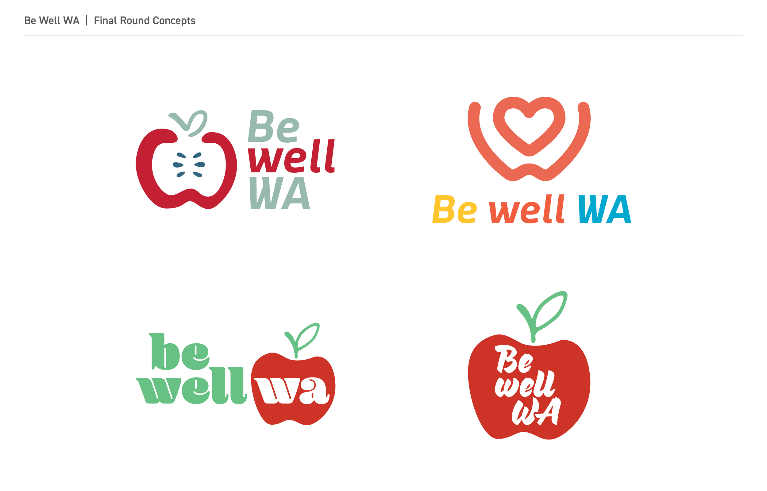 Once the final review was completed, a favorite concept emerged. The apple icon in the Be Well WA logo uses abstract letterforms of a lowercase ‘b’ in the stem and leaf and a ‘w’ to create the body of the apple. With the logo concept decided on, I tried out some different shapes for the body of the apple and colorways for the red of the apple, stem and seeds.